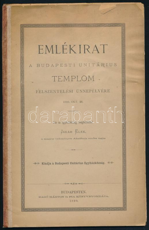 Jakab Elek: Emlékirat a Budapesti Unitárius Templom felszentelési ünnepélyére. 1890. okt. 26. Bp., 1890, Budapesti Unitárius Egyházközség (Bagó Márton és Fia-ny.), 40+(2) p. (+ A Budapesti Unitárius Egyházközség templom-szentelési ünnepélyének sorrendje, valamint díszebédjének étrendje, 5 sztl. lev.) Kiadói papírkötés, sérült borítóval, ragasztott gerinccel, ex libris-szel (sepsiszentiványi Szent-Iványi Sándor (1902-1983) unitárius püspök, egyházi író, történész, politikus).