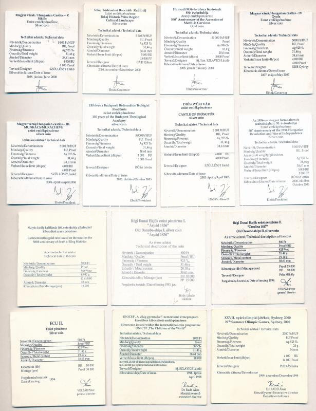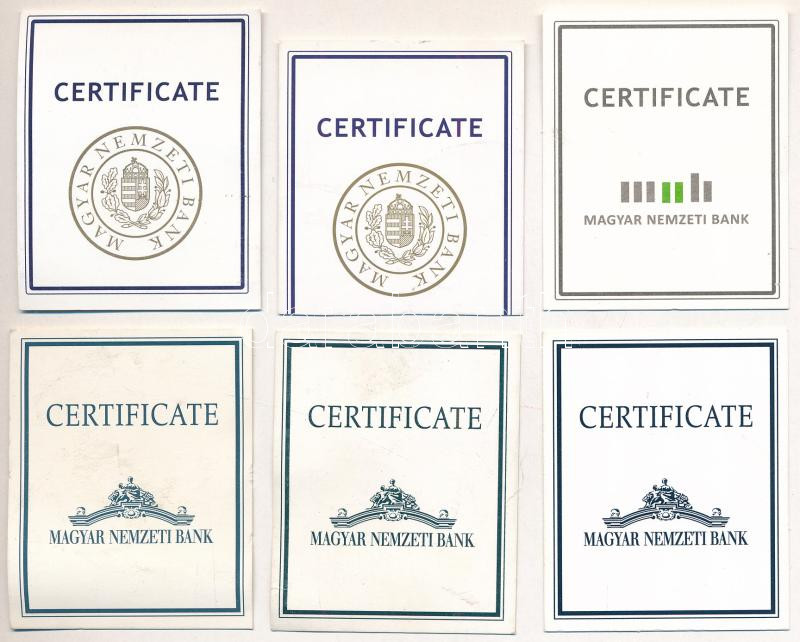 Description: 1990-2018. 20db MNB tanúsítvány, mind különböző emlékpénzhez, többnyire jó állapotban, közte tanúsítvány az 1990. 5000Ft Au "Mátyás király" emlékérméhez.