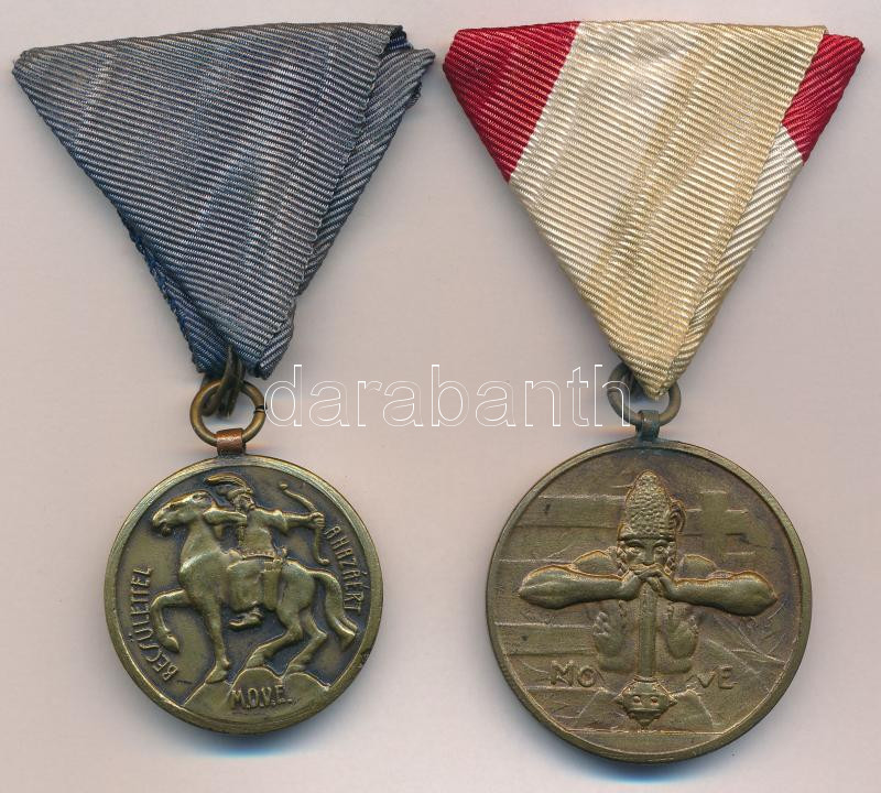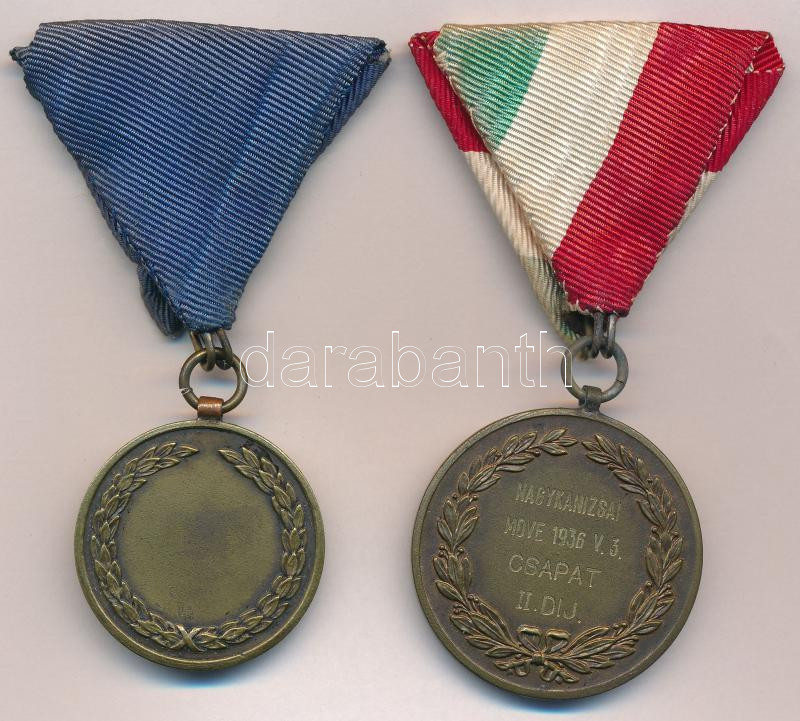 Homonnay Jenő (1883-?) ~1930. "MOVE (Magyar Országos Véderő Egylet) - Becsülettel a hazáért" kétoldalas, bronz díjérem füllel, "GÁL" gyártói jelzéssel, kék mellszalagon (30mm) + ~1940. "MOVE (Magyar Országos Véderő Egylet)" kétoldalas bronzozott fém díjérem füllel, fakó nemzetiszín szalagon (30mm) T:XF
