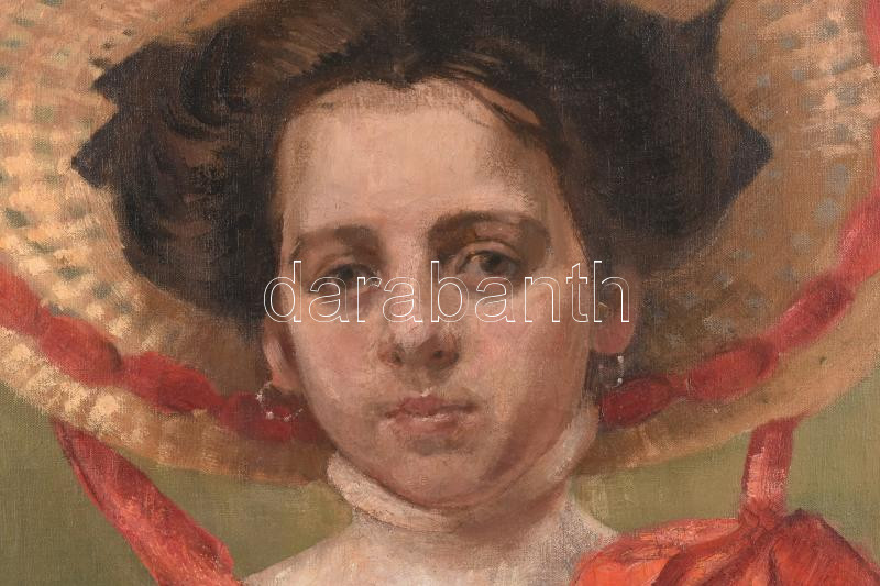 XX. sz. elején működött magyar festő: Kalapos hölgy portréja, 1909. Olaj, vászon. Jelzés nélkül. Balra lent Restaurált. Paszpartuban. 57,5×46,5 cm. / Hungarian painter: Lady in hat, 1909. Oil on canvas, unsigned. Restored.