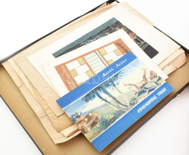 Description: Molnár László grafikus művész kb 70 db reklám és propaganda plakát terve, könyvborító terv. Akvarell, papír, vegyes technika, klf méretben, látványos darabokkal az 1950-es évekből A/3 méretig