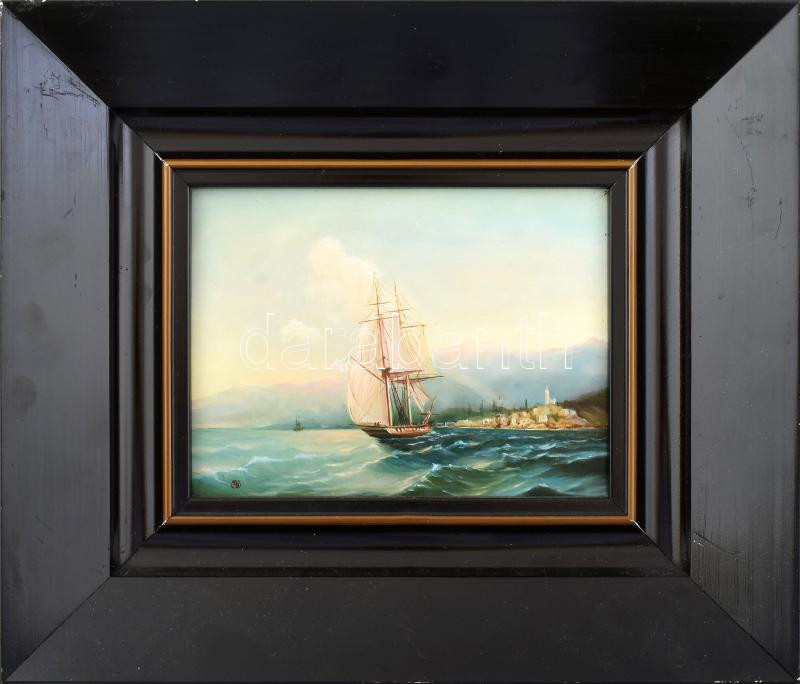 Monika Bończa-Tomaszewska (?-), XX. sz. vége: Kétárbócos vitorlás. Olaj, farost. Jelezve balra lent. 14x18 cm Dekoratív fakeretben.