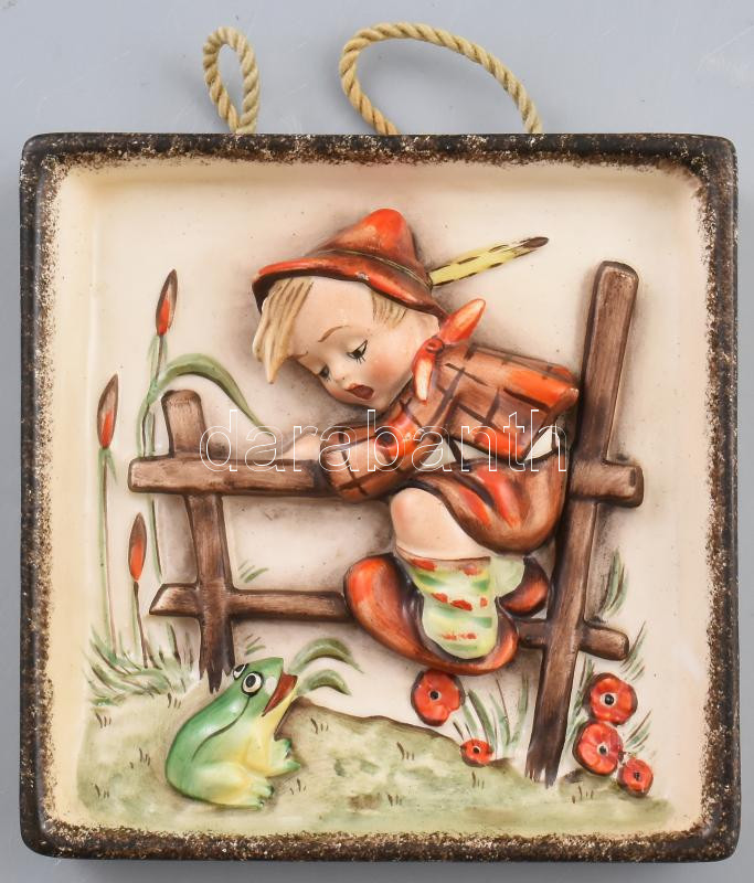 Hummel falikép, békától megijedő fiú, jelzéssel, kézzel festett, kis kopással, 13x12,5 cm