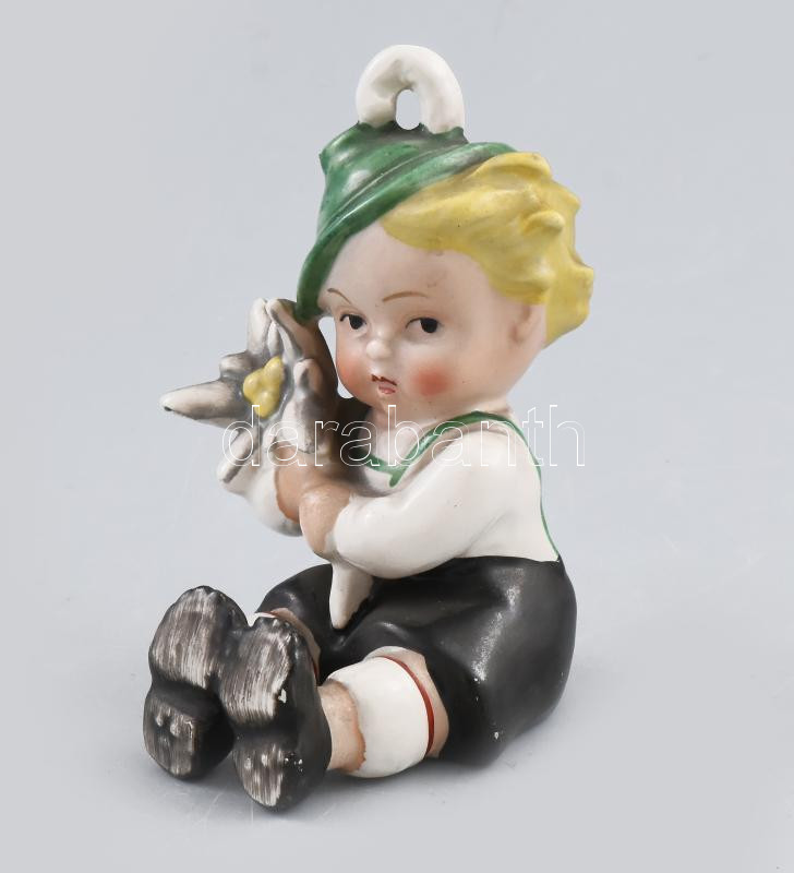 Hummel kisfiú virággal. Jelzéssel, kézzel festett, minimális mázkopással, m: 10 cm