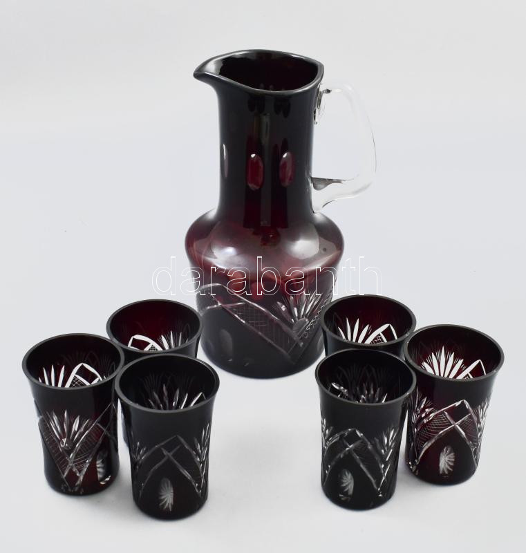 Csiszolt bordó kristályüveg boros készlet, jelzés nélkül, kopásokkal, m: 11 cm, 27 cm