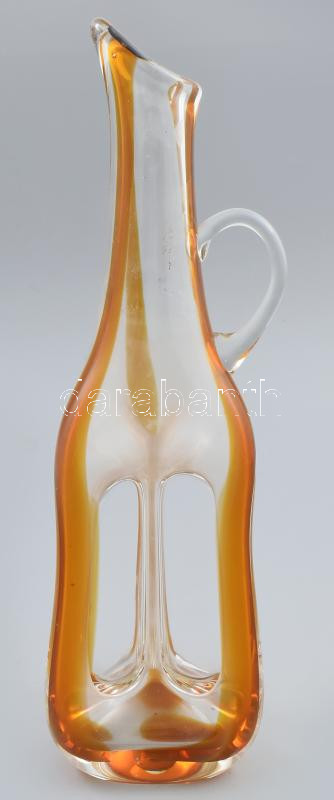 Murano díszkancsó. Háromfelé lapított testű, anyagában színezett üveg, jelzés nélkül, minimális kopottsággal, m: 32 cm