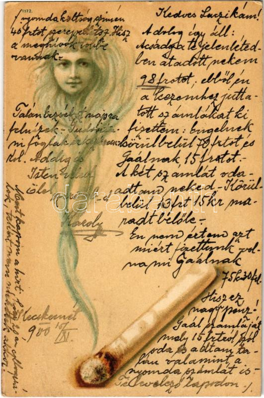 1900 Art Nouveau lady art postcard with cigarette and smoke. litho (EK...