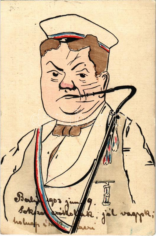 1903 Studentika - kézzel rajzolt tanuló ünneplőben pipával / Studentica - hand-drawn student in uniform with pipe (fa)