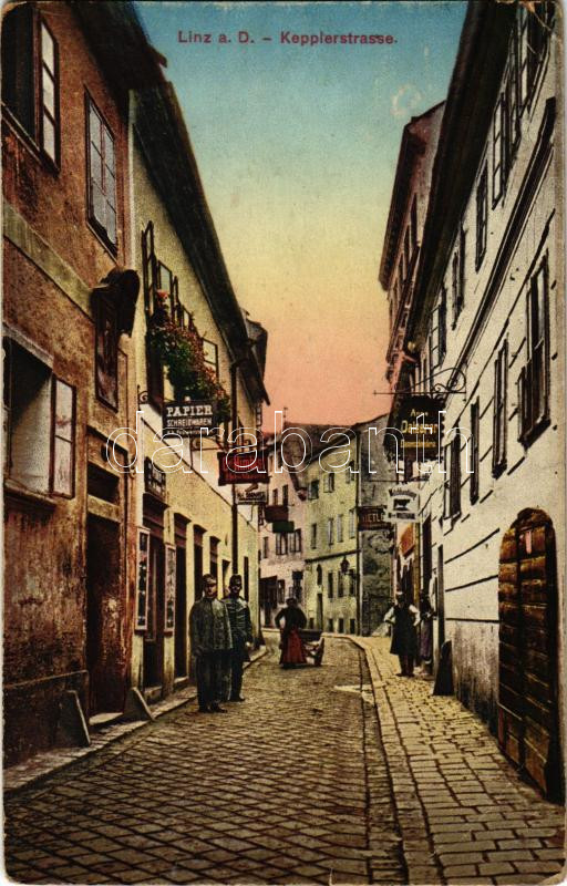 1923 Linz, Kepplerstrasse, Anna Dalgerer, Papier Schreibwaren, Carl Himblst, Milchhandlung Wiltham / street, shops (EK)