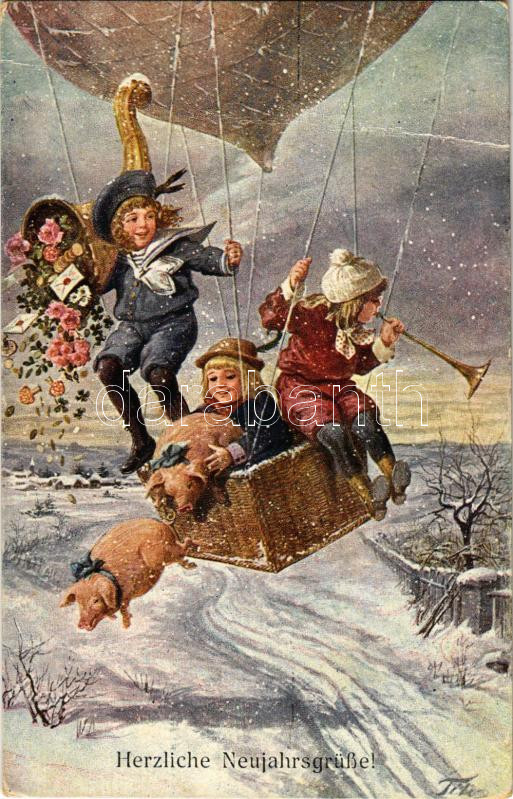 1922 Herzliche Neujahrsgrüße! / New Year greeting art postcard with hot air balloon, pigs and children (EK)