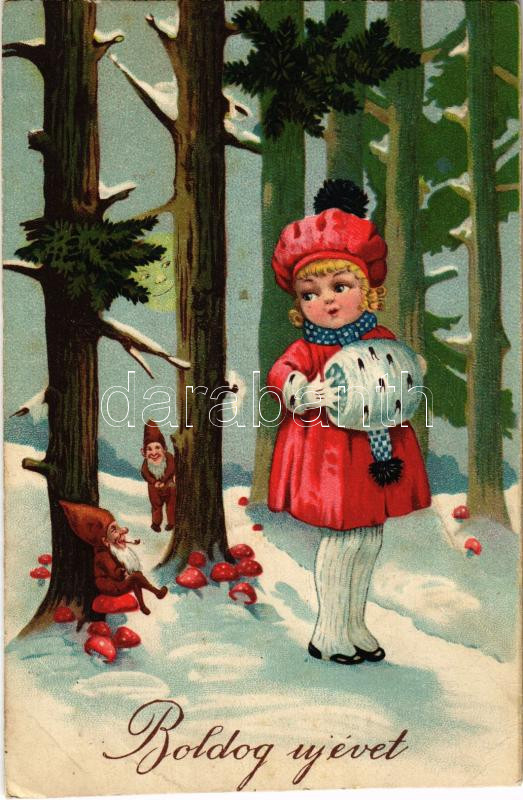 Boldog Újévet / New Year greeting art postcard with dwarves, mushroom and girl (vágott / cut)