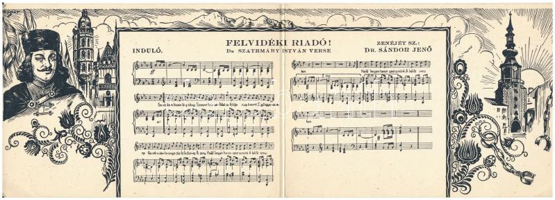 Description: Felvidéki riadó! Rákóczi Ferenc induló kottával. 2-részes irredenta kihajtható képeslap. Magyar Nemzeti Szövetség kiadása / Upper Hungarian irredenta marching song with music sheet, 2-tiled folding card s: Zsolt (EK)