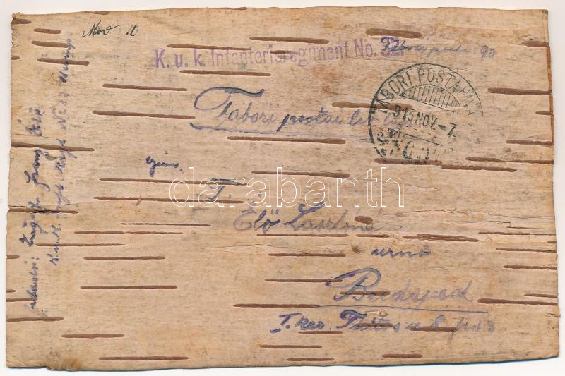 Description: 1915 Oroszország. Első világháborús osztrák-magyar tábori posta nyírfakéregből / WWI K.u.k. military field post made of birch tree bark + "K.u.k. Infanterieregiment No. 32."