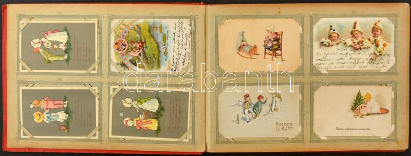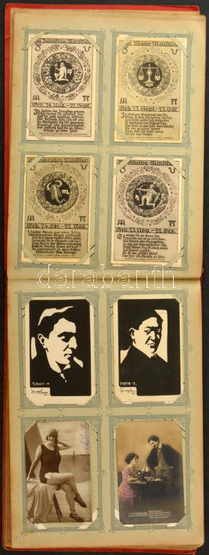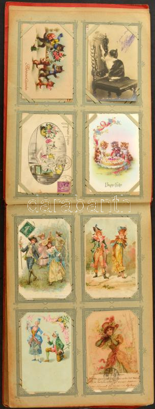 Kb. 200 db RÉGI képeslap 1899-től 1945-ig nagy szecessziós albumban: motívumok kevés várossal, üdvözlőlapok, hölgyek, párok, gyerek, humor, vadászat, sziluettes, hóember, angyal, törpe, bohóc, Munk, kutya és macska, állatok, nyuszi, tánc, pár fotó, kézzel festett és rátétes lapok, Art Deco és szignáltak (Castelli, Pauli Ebner, Anichini, Usabal, Adorján, Beatrice Mallet, Sándor Károly, Yvon, Pappini, Kratki, Márton Lajos, Guerzoni, Atwell, Colombo, Margret Boriss, Pólya + 12 darabos horoszkóp sorozat