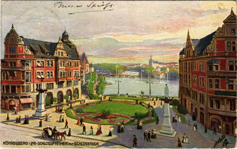 1909 Kaliningrad, Königsberg i. Pr.; Schlossfreiheit mit Schlossteich / square, castle, pond, shops. Raphael Tuck & Sons "Oilette" serie No. 627 (worn corners)