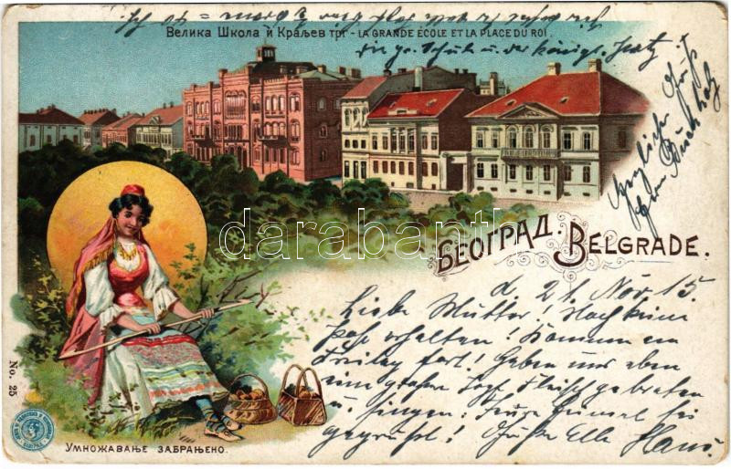 Belgrade, La Grande École et la Place du Roi / school, folklore. Art Nouveau, floral, litho (EK)