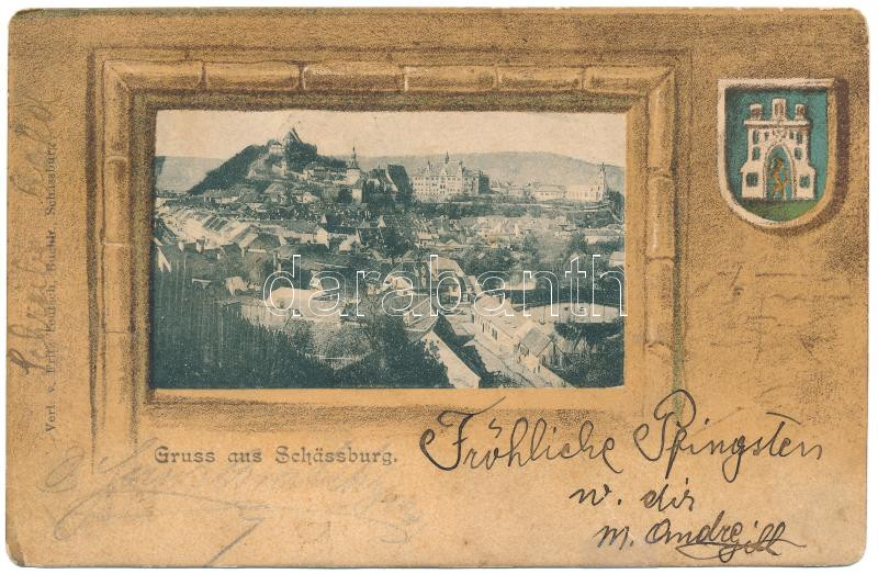1904 Segesvár, Schässburg, Sighisoara; látkép. Szecessziós címeres lit...