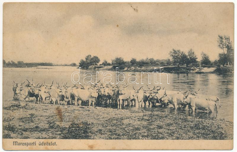 1910 Marosparti üdvözlet. Adler fényirda / Greetings from the Mures riverside, cattle (EK)