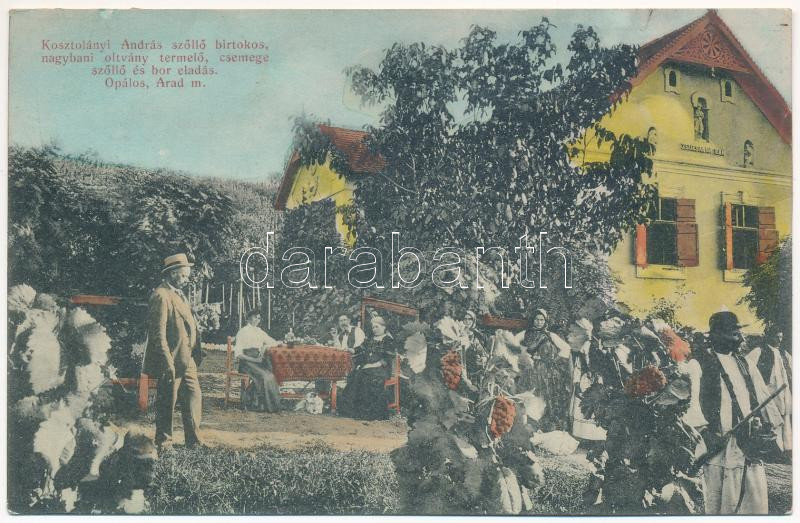 1916 Ópálos, Ó-Pálos, Ópaulis, Paulis (Arad-Hegyalja); Kosztolányi András szőlő birtokos, nagybani oltvány termelő, csemege szőlő és bor eladás, Zsuzsanna lak, szőlőkert permetezéskor / vineyard owner's villa, spraying, advertisement (non PC) (vágott / cut)