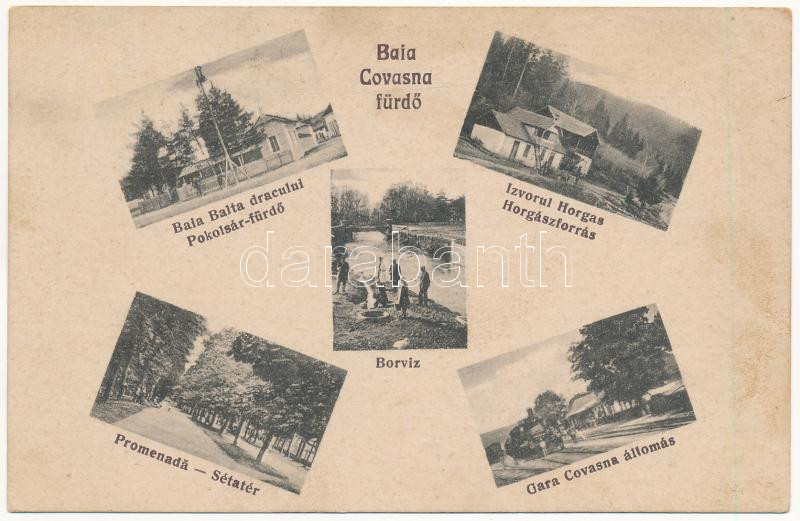 1931 Kovászna-fürdő, Baile Covasna; Pokolsár-fürdő, Horgászforrás, Borvíz, Sétatér, Vasútállomás, gőzmozdony, vonat / Baia Balta dracului, Izvorul Horgas, Promenada, Gara / spa, bath, mineral spring source, pormenade, railway station (fl)