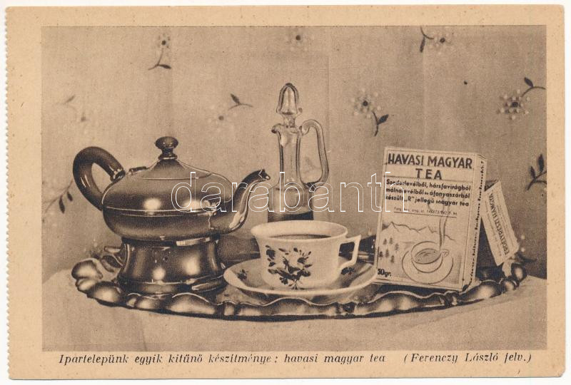 Meggyesfalva, Mureseni; Likőrgyár ipartelepének reklámlapja. Havasi magyar tea. Erdélyrészi Hangya Szövetkezet kiadása, Ferenczy László felvétele / Hungarian tea advertisement of the liqueur factory (EK)