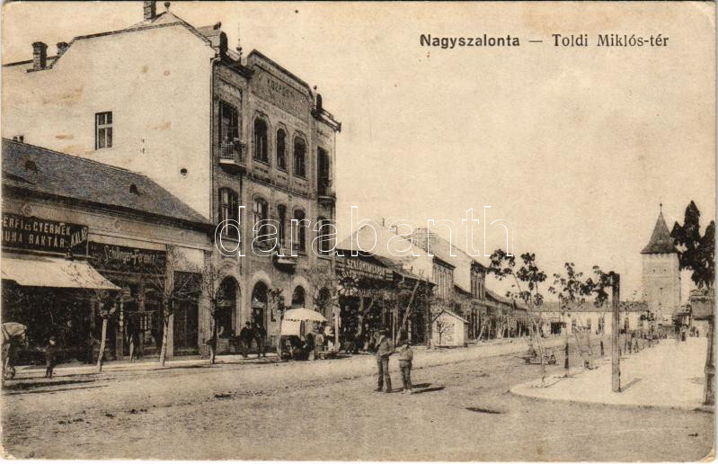 Nagyszalonta, Salonta; Toldi Miklós tér, Férfi és gyermek ruha raktár, Schillinger Ferenc üzlete, Központi szálloda, étterem és kávéház, Szalontai Lapok politikai napilap irodája. Döme Károly kiadása / square, shops, hotel, restaurant and cafe, newspaper's office