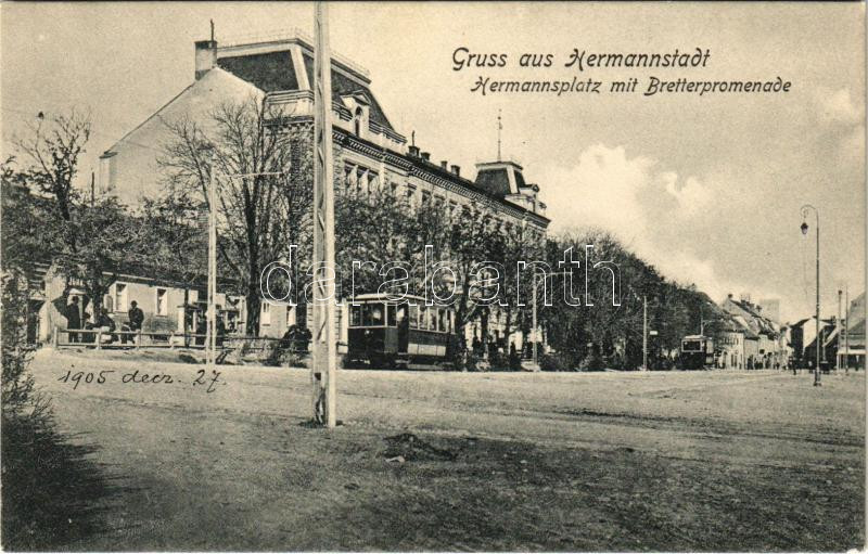 Nagyszeben, Hermannstadt, Sibiu; Hermannsplatz mit Bretterpromenade / Fő tér, villamosok. Karl Graef kiadása / main square, trams