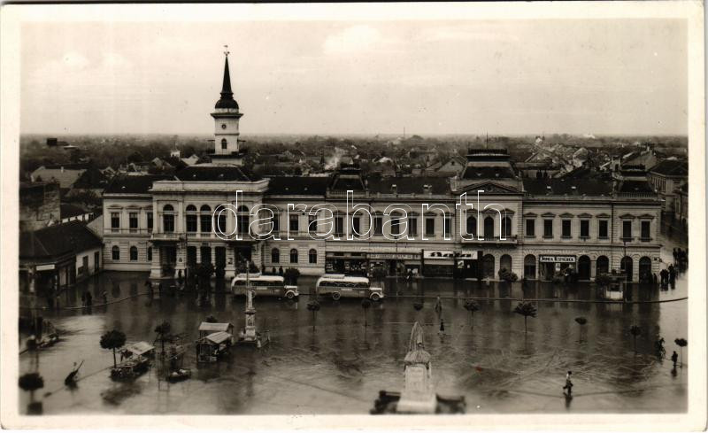 Óbecse, Stari Becej; községháza, Szent István tér eső után, MÁVAUT autóbuszok, Hubet Izidor, Janek Testvérek, Bata cipő és fodrászterem üzlete, piaci bódék. Hungária nyomda kiadása / town hall, square after rain, shops, autobuses, market stalls