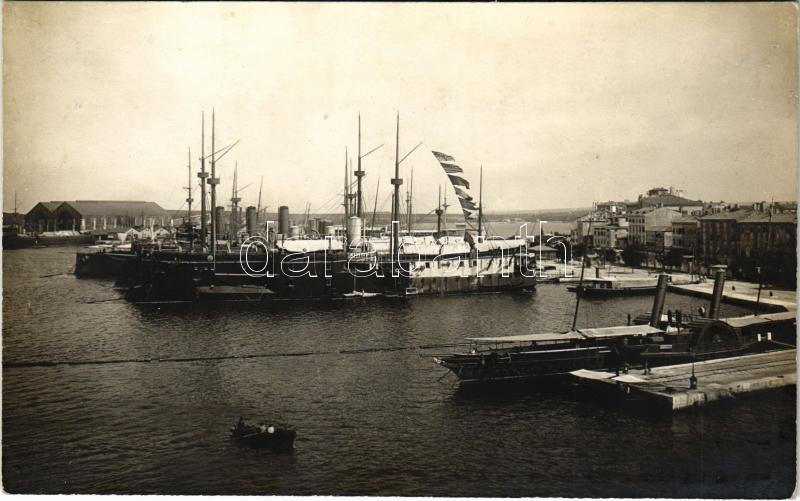 Description: 1913 Pola, K.u.K. Kriegsmarine Kriegshafen / Osztrák-magyar haditengerészeti kikötő, teljesen feketére festett SMS FANTASIE és a félig feketére festett SMS Erzherzog Albrecht / Austro-Hungarian Navy port, SMS Fantasie painted black. Phot. Alois Beer, Schrinner 1913.