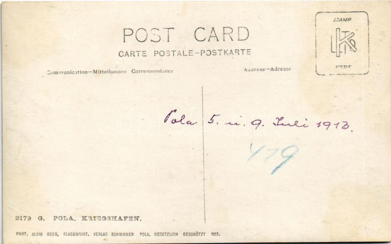 1913 Pola, K.u.K. Kriegsmarine Kriegshafen / Osztrák-magyar haditenger... https://www.darabanth.com/en/448-Online-auction/448.0/Postcards/Warships~1500059/1913-Pola-KuK-Kriegsmarine-Kriegshafen-Osztrak-magyar-haditengereszeti-kikoto-teljesen-fe~II2956479