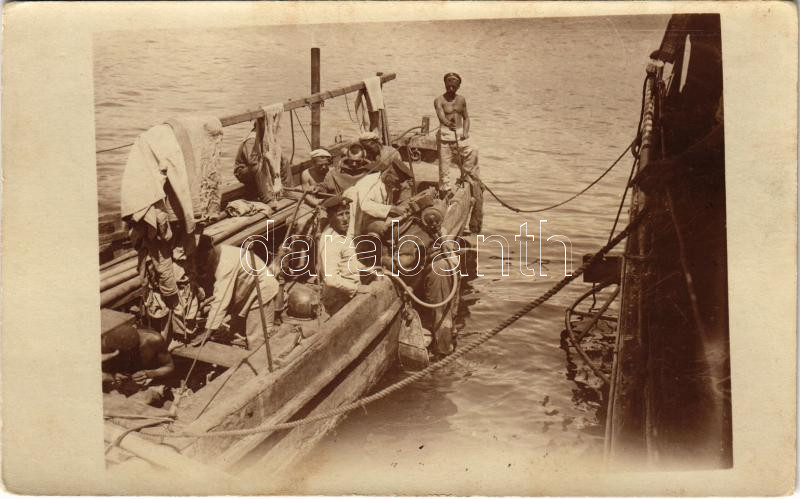 Description: 1918 SMS Lika osztrák-magyar Tátra-osztályú romboló búvára mielőtt lemerül ellenőrizni a propellereket az SMS Salzburg elleni ütközet után / K.u.K. Kriegsmarine Taucher / Diver of SMS Lika Austro-Hungarian Navy Tatra-class destroyer before checking the propellers. photo (Rb)