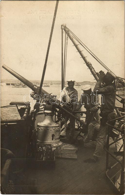 Description: SMS Erzherzog Friedrich (?) Osztrák-Magyar Haditengerészeti csatahajó fedélzete, matrózok légvédelmi fegyverreel / K.u.K. Kriegsmarine Linienschiffe / Austro-Hungarian Navy battleship, mariners with a 47 mm, cal 33, Hotchkiss-system rapid fire antiaircraft gun. Stephan Vlach (Josef Makovicka)