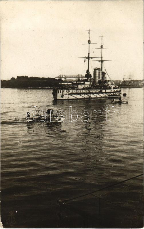 Description: SMS Viribus Unitis Osztrák-Magyar Haditengerészet Tegetthoff-osztályú csatahajója előtt éppen landol egy Lohner E15 típusú hidroplán (hydroplán) / K.u.K. Kriegsmarine Seeflugzeug / Austro-Hungarian Navy battleship and seaplane. Stefan Vlach (Josef Makovicka) (EK)