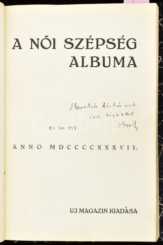Bródy István: A női szépség albuma. DEDIKÁLT! Bp., 1937,Uj Magazin. Kiadói egészvászon kötés, sérült gerinc, kopottas állapotban.