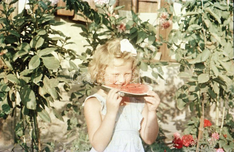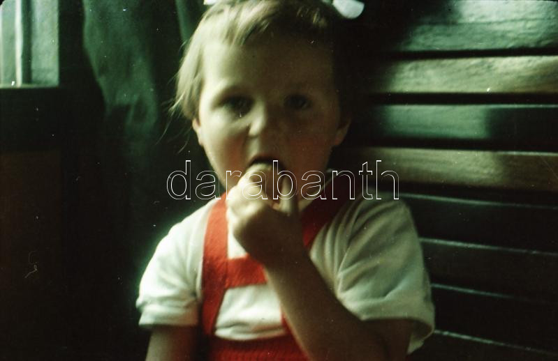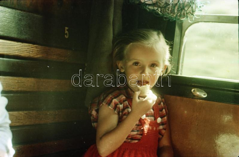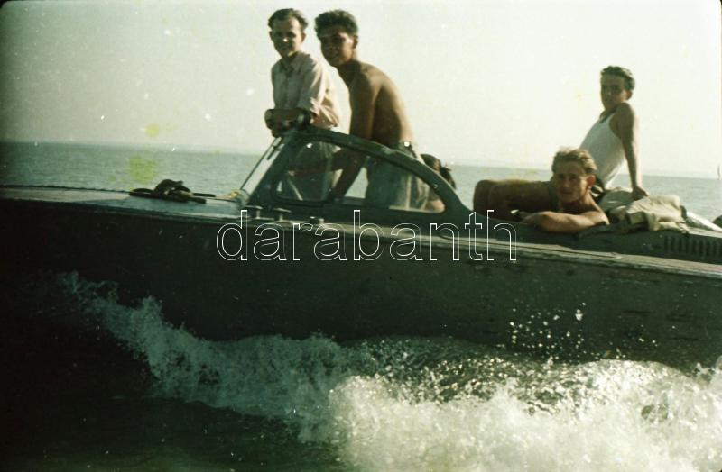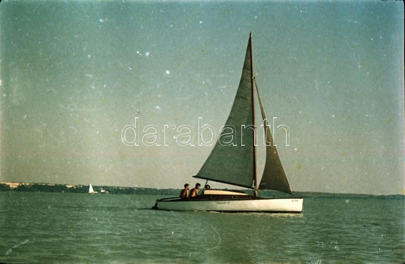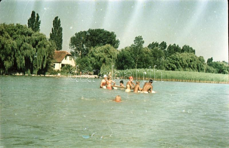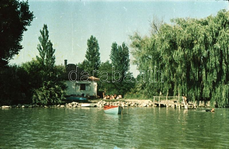 1956 Balatonkenese színes felvételeken, a képek elősorban családi emlékképek, de a korabeli környezet (táj, motorcsónak, vitorlás, fürdőzők, stb) is tanulmányozható a felvételeken, szerzője ismeretlen, a negatívok szabadon felhasználhatók, 50 db vintage színes NEGATÍV, 24x36 mm