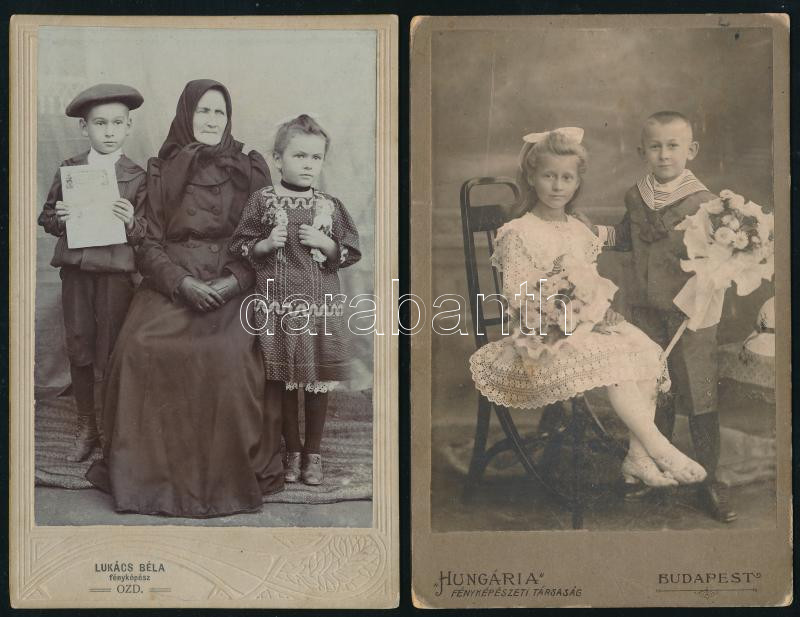 Description: cca 1910 2 db keményhátú kabinetfotó: Nagymama unokáival, Lukács Béla ózdi műterméből + Testvérpár, a "Hungária" fényképészeti társaság budapesti műterméből, 16,5x10,5 cm