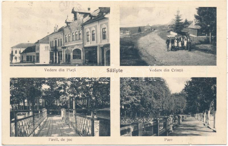 1943 Szelistye, Salistea Sibiului, Saliste; Vedere din Piata, Crintii, Pavil. de joc, Parc / Fő tér, üzletek, szálloda, zenepavilon, park / main square, shops, hotel, music pavilion, park (kis szakadás / small tear)
