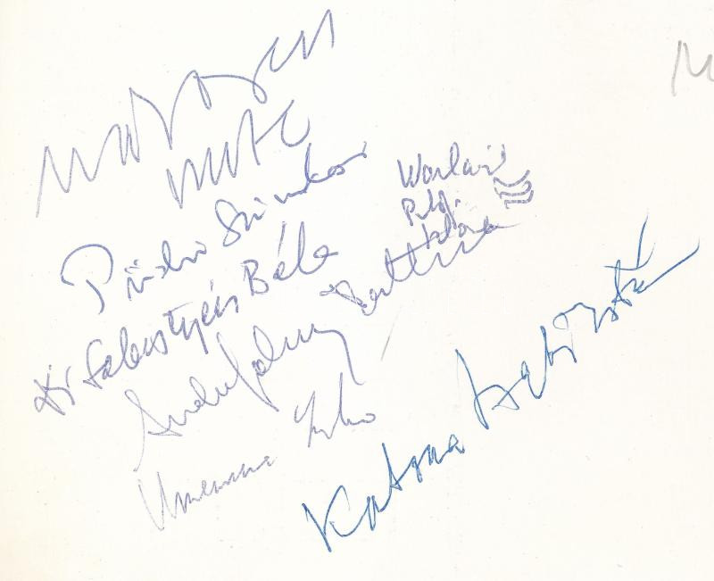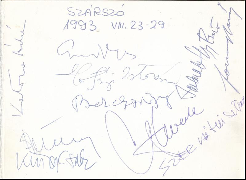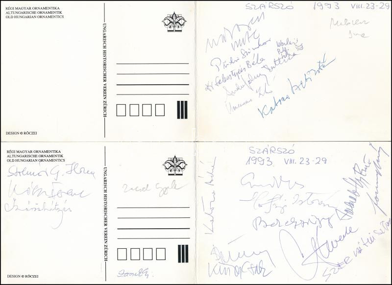 1993 Balatonszárszó, az I. Szárszói Találkozón részt vevő értelmiségiek által aláírt 2 db képeslap, összesen 21 db aláírással, köztük Szűrös Mátyás (1933- ) politikus, Makovecz Imre (1935-2011) építész, Szervátiusz Tibor (1930-2018) szobrász, Püski Sándor (1911-2009) könyvkiadó, Andrásfalvy Bertalan (1931- ) néprajzkutató, politikus, Stolmár G. Ilona, Zacsek Gyula és mások
