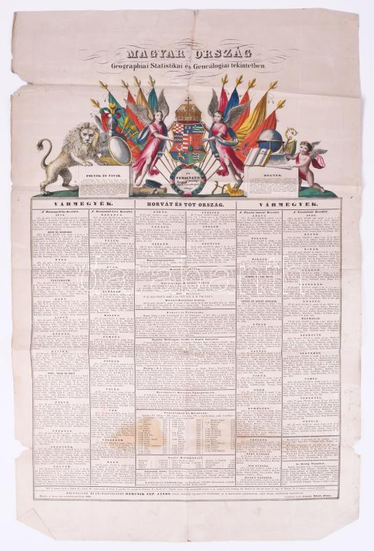 A tabló főcíme alatt a Magyar Királyság angyalokkal és színes zászlókkal övezett címere látható. A címer alatt babérkoszorús tondóban a következő felirat: "Vk. Ferdinand Magyar király / Éljen és uralkodjék / sokáig!". A táblázat színezett keretének két oldalán 1-1 tábla látható, "FOLYÓK ÉS TAVAK." ÉS "HEGYEK." felirattal. A táblázat három fő oszlopra van osztva: a két oldalsó "VÁRMEGYÉK." feliratú oszlop egy "HORVÁT ÉS TÓT ORSZÁG." feliratú oszlopot fog közre. Ezen oszlopokon belül kapnak helyet a vármegyék kerületekre osztott ismertetései, közigazgatási adatok, geográfiai és népességi statisztikák de az ország uralkodóinak listája is. A táblázat legalsó sorában dedikációs felirat olvasható: "BUDÁN, A' MAGY. KIR. EGYETEM BETŰIVEL, 1838. / MÉLTÓSÁGOS, ÉS FŐ-TISZTELENDŐ DERCSIK NEP. JÁNOS URNAK, PRISTINEI VÁLASZTOTT PÜSPÖKNEK, M. K. HELYTARTÓI TANÁCSOSNAK, APÁT, ESZTERGOMI KANONOKNAK / tisztelettel ajánlja Lencsó Mihály János.".Színezett rézmetszet Hajtva, kis lyukkal a hajtásnál. Egy folttal 49x75 cm