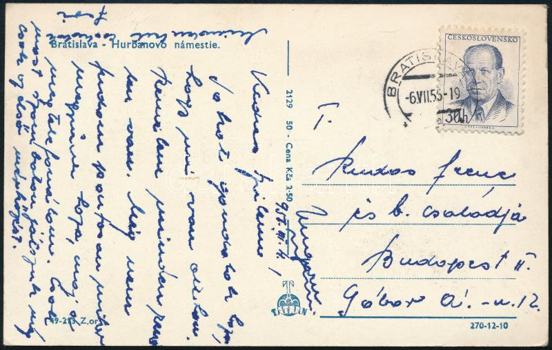 1955 Pozsony, Rudas Ferenc (1921-2016) válogatott labdarúgó, az FTC játékosának saját kezűleg megírt, szüleinek hazaküldött képeslapja