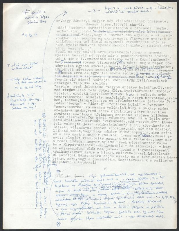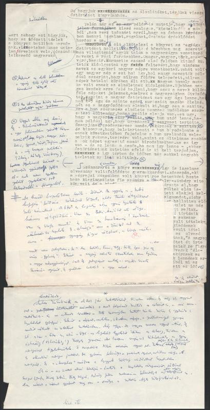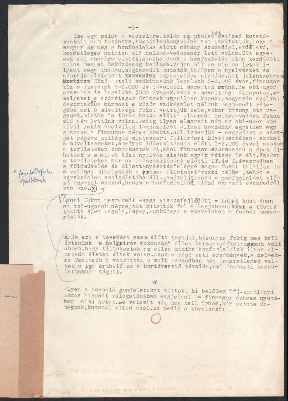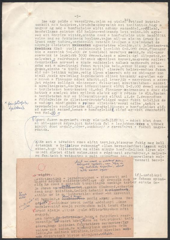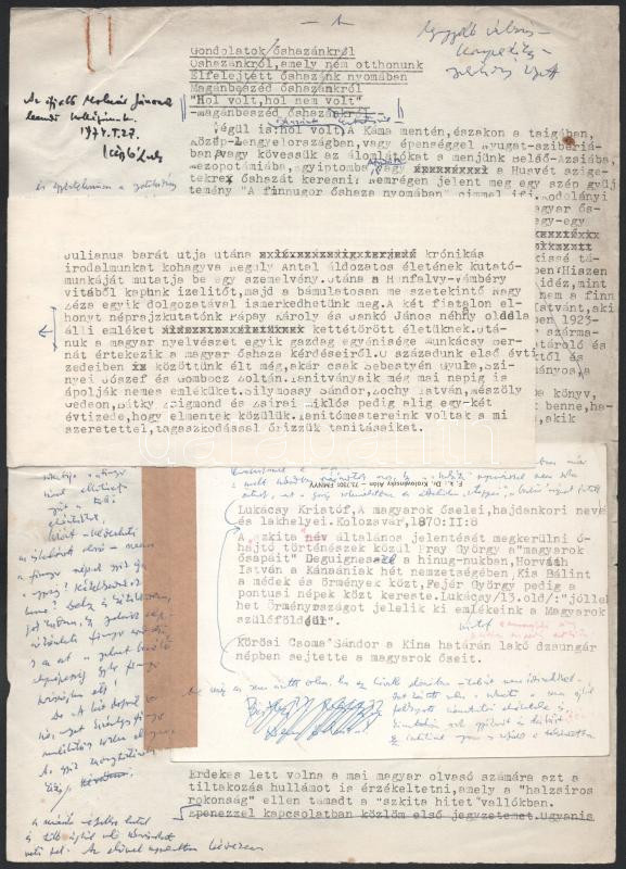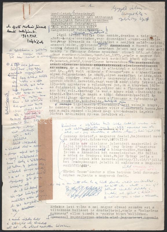 1975 László Gyula (1910-1998) történész, Å‘shaza kutatással kapcsolatos, - kiegészÃtésekkel, betoldásokkal - 5 oldalas kézirata, tanulmánya, mely a IV. Nemzetközi Finnugor Kongresszus elÅ‘adás anyaga volt. FeltehetÅ‘en a lektor útmutatásinak megfelelÅ‘ végleges változat, melyet a szerzÅ‘ hallgatóságának dedikált.