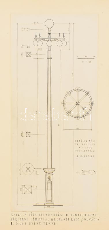 ca 1950 Gebhardt Béla (1901-1990): A Sztálin téri felvonulási útvonal díszvilágítási lámpája. BUVÁTi, a tervező autográf aláírásával. 22x30 cm + fotó az elkészült munkáról, a képen láthatóak a z eredeti lámpák is.
