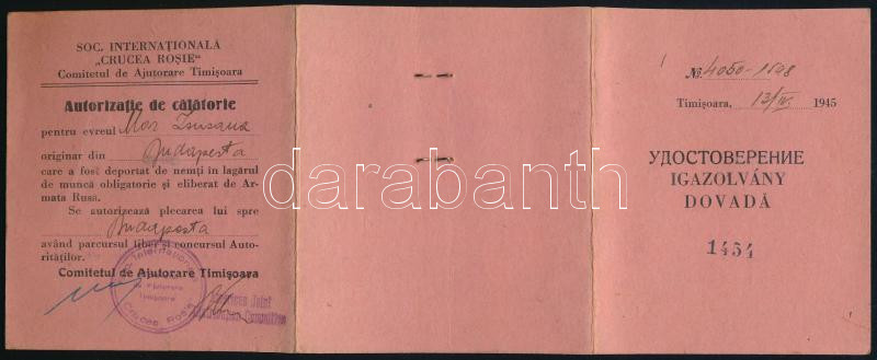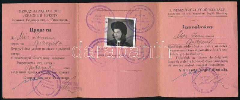 Description: 1945 Temesvár, Nemzetközi Vöröskereszt keretében működő temesvári Segítő Bizottság fényképes igazolvánbya Mór Zsuzsanna budapesti illetőségű zsidó személy részére, akit a németek kényszermunkára deportáltak és a Vörös Hadsereg felszabadított. A temesvári Segítő Bizottság pecsétjével, aláírással, magyar és orosz nyelven.