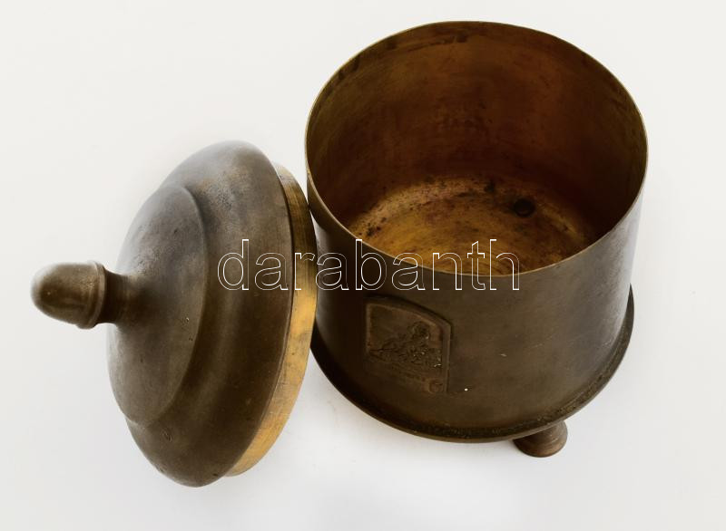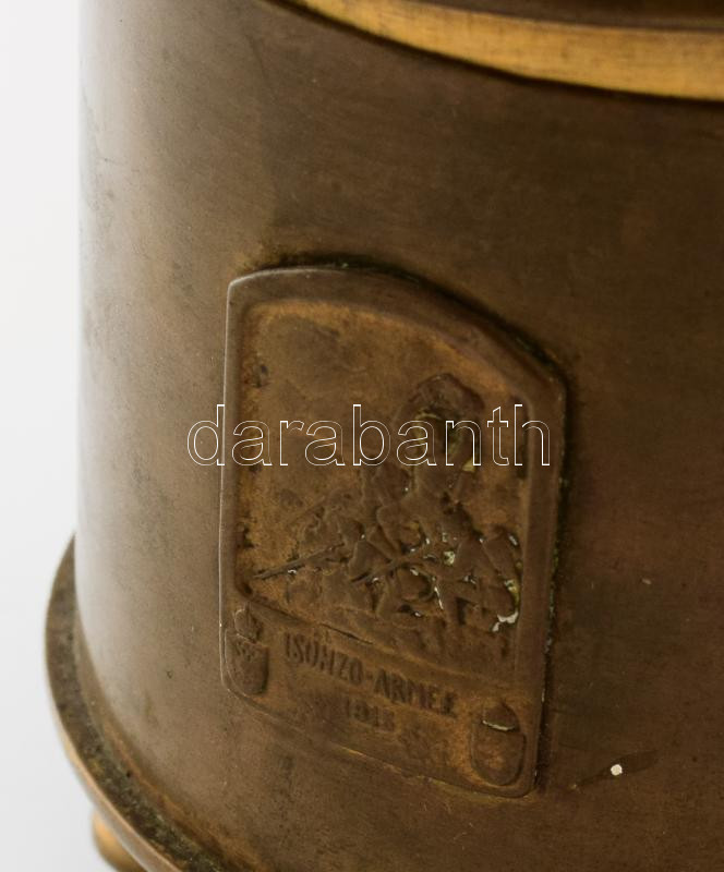 Description: I. világháborús emléktárgy, 10 cm Feldhaubitze M 99 tábori ágyú lövedékéből kialakított, három lábon álló fedeles tároló, oldalán "Isonzo-Armee 1915" jelvénnyel, alján jól láthatók a lövedék eredeti gyártói jelzései, m: 17,5 cm, d: 11,5 cm