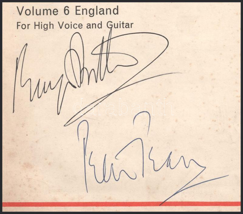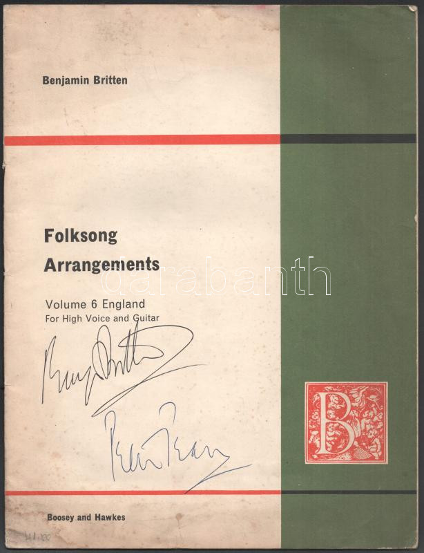 Benjamin Britten: Folksong arrangements. Benjamin Britten (1913-1976) angol zeneszerző, karmester, zongorista és Sir Peter Pears (1910-1986) angol tengor operaénekes által ALÁÍRT példány! Vol. 6 Enland. For high voice and guitar. Guitar part edited by Julian Bream. London,én.,Boosey & Hawkes, 4+16 p. Angol nyelven. Kiadói papírkötés, foltos borítóval. /