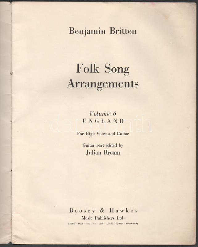 Vol. 6 Enland. For high voice and guitar. Guitar part edited by Julian Bream. London,Boosey & Hawkes, 4+16 p. In English language. Paperbinding, with spotty cover.