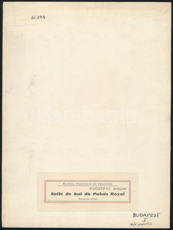 Description: cca 1930-1939 Budapest, a Budavári Királyi Palota bálterme, nagyméretű fotó, a hátoldalon a Székesfővárosi Idegenforgalmi Hivatal a kép sokszorosítását is engedélyező, francia nyelvű címkéjével, 23,5x17,5 cm