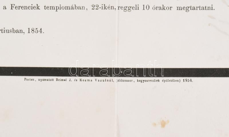 1854 Nagy Ignác író gyászjelentése. Pest. Beimel J. és Kozma Vazul. Nagy Ignác (1810-1854) író a Hölgyfutár szerkesztője, az MTA levelező tagja volt.