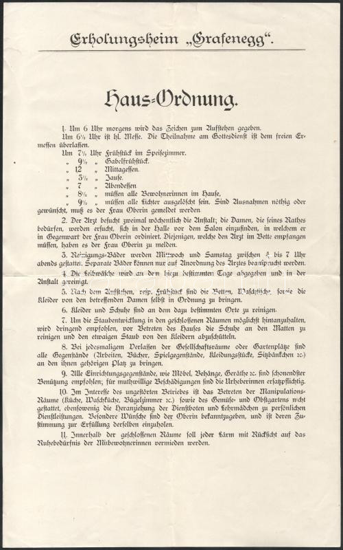 cca 1910 Az alsó-ausztriai Grafenegg szanatórium házirendje, hajtva, j...