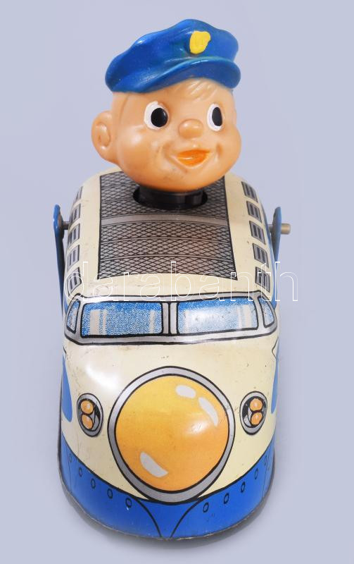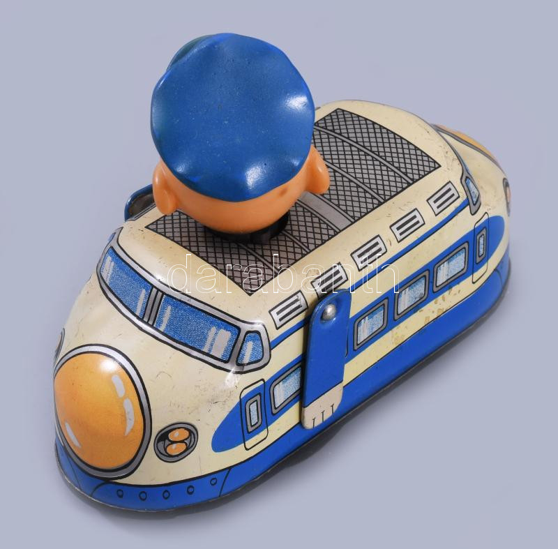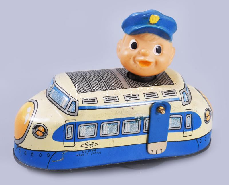 cca 1965 Yone No. 2164 Crazy Train japán lemezjáték, eredeti dobozában, jó állapotban, de nem működik, eredeti kulccsal, h: 11,5 cm /// c. 1965 Yone No. 2164 Crazy Train Japanese tin toy, in its original box, in good condition but not working, with original key, length: 11.5 cm.